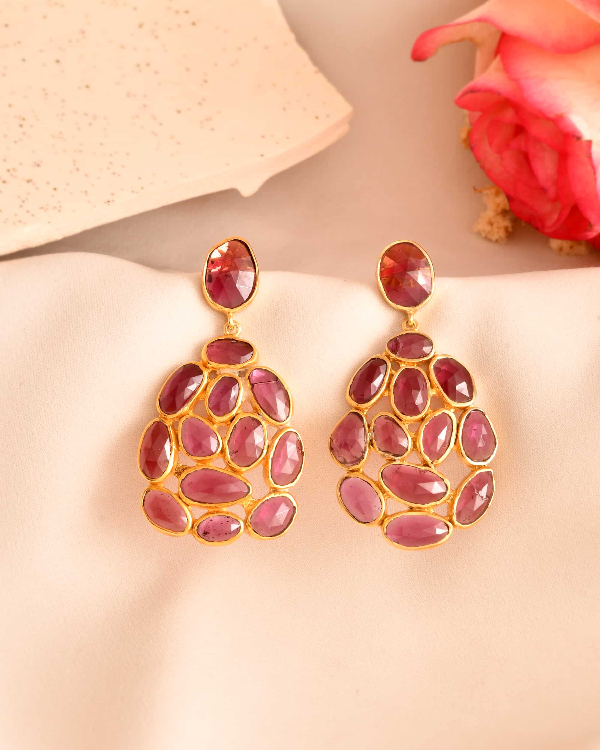Deep garnet stones set in warm gold, rich, radiant, and full of depth. Make a statement, without having to carry the weight.